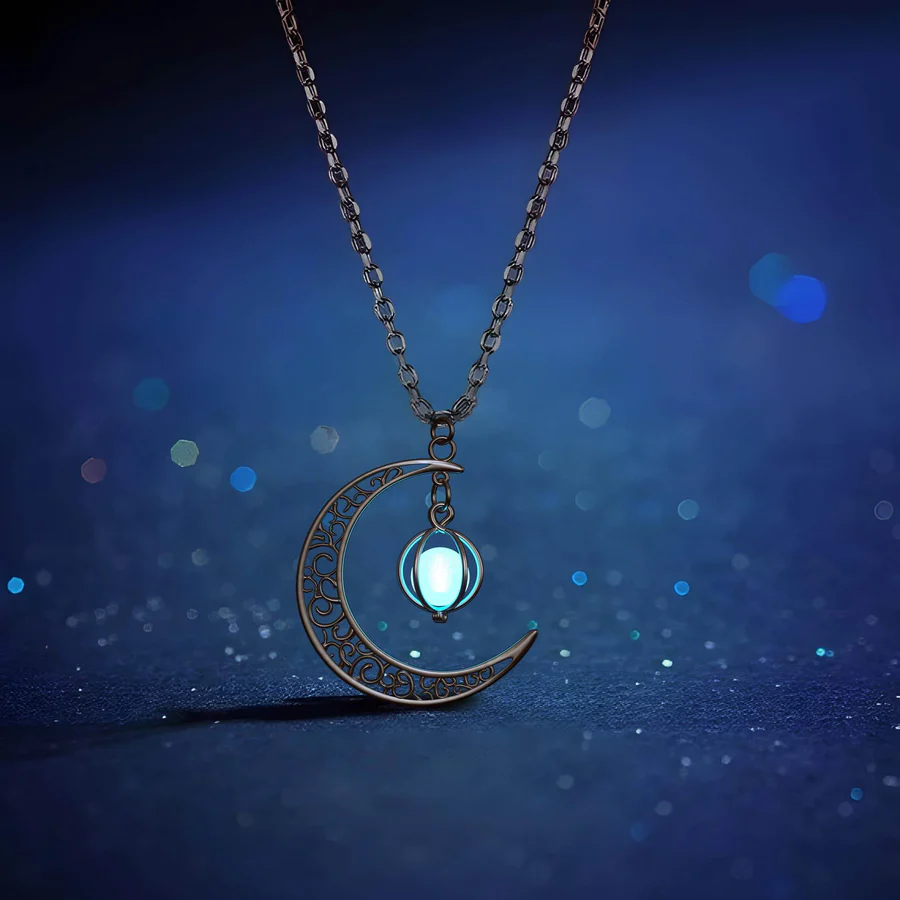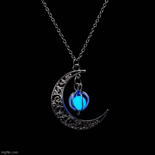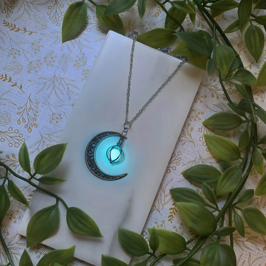 Perla din interiorul acestui pandantiv este realizată dintr-un material special care strălucește în întuneric. Este alb sub iluminare normală, dar strălucește sub acoperirea întunericului.